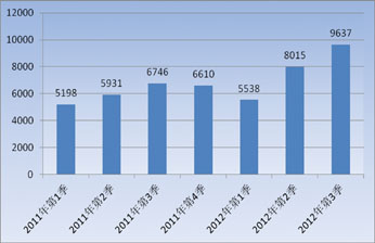 15家农村商业银行发行392款,环比增长27.27%。农村商业银行是银行界的新家族,也是银行理财业务的新生力量。因为农村商业银行由农村信用社转型而来,具有大量的农村与郊区客户。随着经济的发展,这些人群的收入明显增长。根据统计,2011年农村家庭人均收入(全国)接近6000元,不少家庭具有可观的储蓄。同时,随着与城镇联系的增多,这一群体的理财意识也在增强。(图2)