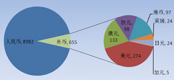币种分布上,新发的9637款产品涉及的仍然是人民币、美元、澳元、欧元、港币、英镑、日元以及加元。其中,澳元、欧元、英镑与加元理财产品的发行量较上季度均有小幅减少,而人民币、美元、港币与日元理财产品的发行量较上季度有所增加,增幅最大的是人民币类,共发行8982款,环比增加1636款,增幅达22.27%;市场占比93.20%,环比增加1.55个百分点。(图4)