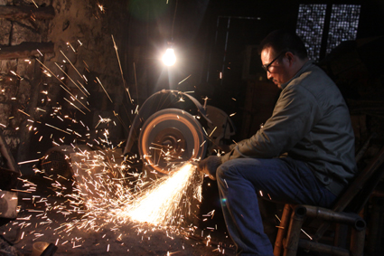 过去,在舟山镇像俞世仓这样以打铁为生的有1000多人,现在还不到20人,原来一起走南闯北的同行们大多都改了行,流水线锻造出的农具更是挤占了手工打铁人的市场,这让俞世仓的心情有些黯淡。而惟一让他感到安慰的是,因为他打制的镰刀更耐用,刀刃更锋利,所以四里八乡的人还会不时的来找他,上海、温州的商人们也跑来找他订购,这才使他还不至于马上失业,但日子也是勉强维持罢了。一把镰刀除去成本,利润也就几块钱,一年下来也就万把块钱的赚头。为了生计,俞世仓凌晨三点开锤,下午五点收工。除了吃饭,他一刻也不离开铁匠铺,满打满算一天也只能打20把镰刀。后来,同村的表哥心疼他,就借了他5000块钱买了气锤。省了力气,但表哥的钱终归是要还的。