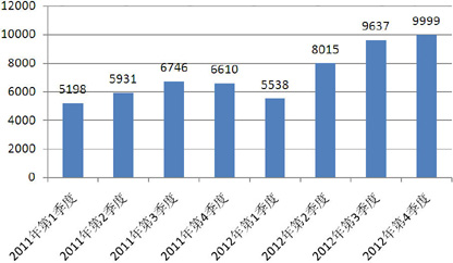 2012年第4季度,商业银行理财市场共发行了9999款理财产品,较上年度同期增长幅度高达51.27%,较上季度增长幅度为3.76%,但环比增速较上季度有所下滑。(图1)