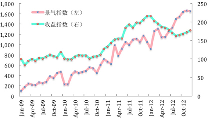 理财指数方面(参见图2),2009年初至2010年末,银行理财产品景气指数呈震荡上行态势,2012年以来该指数处于稳步上行态势,指数上涨幅度逾56.08%强(参见图2)。银行理财产品收益指数与景气指数走势反其道而行,总体趋势呈一路下行,后期略有小幅回升,年度下降幅度为17.86%。景气指数和收益指数
